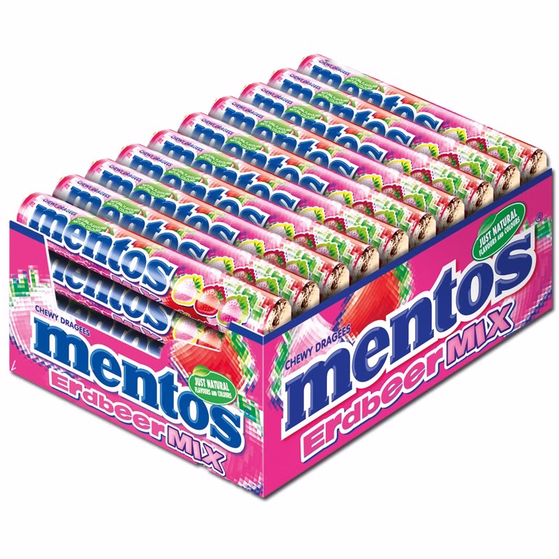 Die kleinen, runden Mentos-Kaubonbons mit der dragierten Außenhülle wurden 1932 von den Brüdern Michael und Pierre van Melle erfunden und seit den 60er Jahren in der noch heute bekannten Rollenform angeboten.
