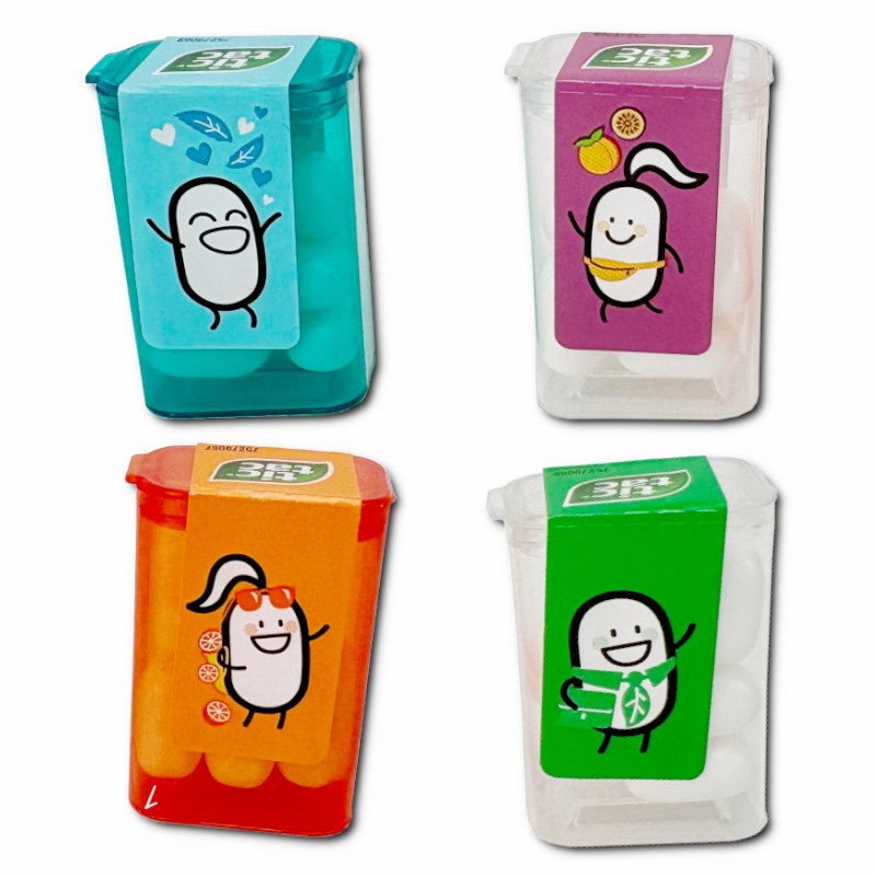 Zutaten: Pfefferminzdragee (Zucker, Maltodextrin, Fruchtzucker, Verdickungsmittel: Gummi arabicum; Reisstärke, Trennmittel: Magnesiumsalze von Speisefettsäuren; Aromen, Pfefferminzöl, Überzugsmittel: Carnaubawachs). Dragees mit Orangengeschmack (Zucker, Maltodextrin, Säuerungsmittel: Citronensäure; Reisstärke, Aromen, Verdickungsmittel: Gummi arabicum; Trennmittel: Magnesiumsalze von Speisefettsäuren; Überzugsmittel: Carnaubawachs). Spearmint-Dragees (Zucker, Maltodextrin, Verdickungsmittel: Gummi arabicum; Fruchtzucker, Reisstärke, Aromen, Trennmittel: Magnesiumsalze von Speisefettsäuren; Überzugsmittel: Carnaubawachs). Dragees mit Pfirsich-Maracujageschmack (Zucker, Maltodextrin, Säuerungsmittel: Citronensäure; Reisstärke, Verdickungsmittel: Gummi arabicum; Aromen, Trennmittel: Magnesiumsalze von Speisefettsäuren; Pfirsichpüreepulver, Maracujasaftpulver, Überzugsmittel: Carnaubawachs).