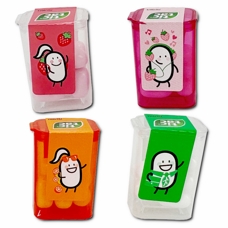 Zutaten: Pfefferminzdragee (Zucker, Maltodextrin, Fruchtzucker, Verdickungsmittel: Gummi arabicum; Reisstärke, Trennmittel: Magnesiumsalze von Speisefettsäuren; Aromen, Pfefferminzöl, Überzugsmittel: Carnaubawachs). Dragees mit Orangengeschmack (Zucker, Maltodextrin, Säuerungsmittel: Citronensäure; Reisstärke, Aromen, Verdickungsmittel: Gummi arabicum; Trennmittel: Magnesiumsalze von Speisefettsäuren; Überzugsmittel: Carnaubawachs). Dragees mit Erdbeergeschmack (Zucker, Maltodextrin, Verdickungsmittel: Gummi arabicum; Säuerungsmittel: Citronensäure, Apfelsäure; Reisstärke, Aromen, Trennmittel: Magnesiumsalze von Speisefettsäuren; Erdbeerpulver, Zitronensaftpulver, Überzugsmittel: Carnaubawachs). Dragees mit Erbeer-Minzgeschmack (Zucker, Maltodextrin, Säuerungsmittel: Citronensäure, Apfelsäure; Verdickungsmittel: Gummi arabicum; Reisstärke, Aromen, Trennmittel: Magnesiumsalze von Speisefettsäuren; Erdbeerpulver, Zitronensaftpulver; Überzugsmittel: Carnaubawachs).