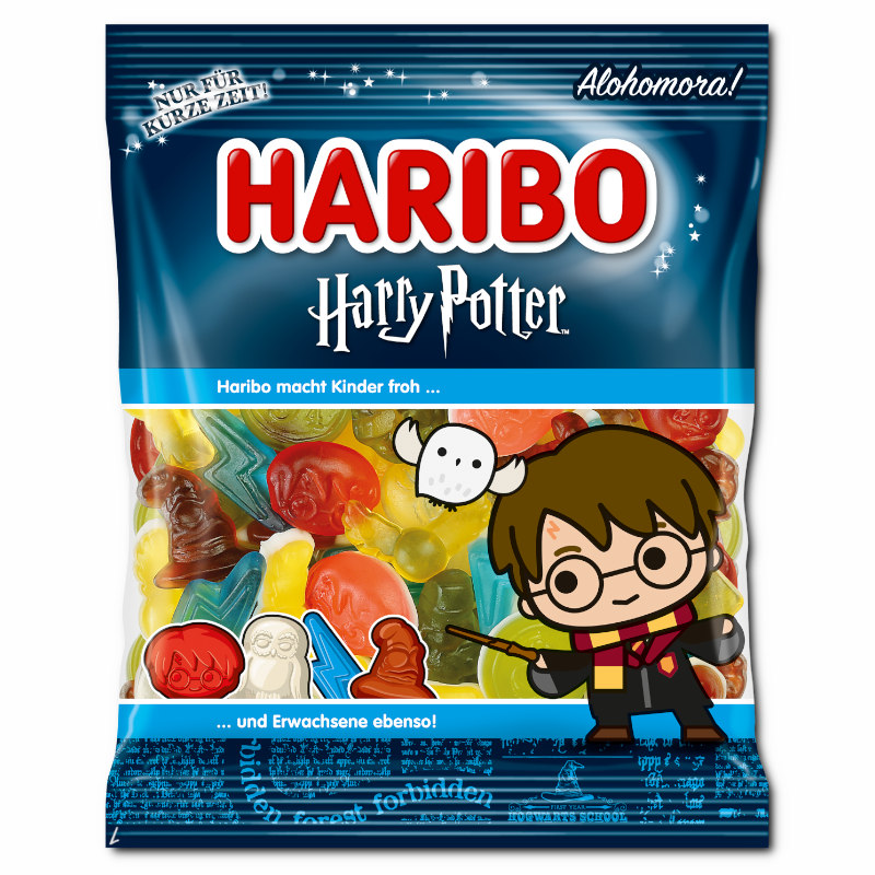Beschreibung: Der Haribo Goldbär war in Hogwarts und hat leckeres Fruchtgummi aus der Welt von Harry Potter mitgebracht. In der Harry Potter Edition befindet sich Fruchtgummi mit einem Schaumzuckerboden in unterschiedlichen Motiven, die mit dem berühmten Zauberer in Verbindung stehen. So gibt es die Leckereien in den Formen von Hedwig, dem sprechenden Hut, der Blitznarbe und natürlich von Harry selber. Die Geschmacksrichtungen sind ebenfalls magisch: Cola, Grüner Apfel, Karamell-Bonbon, Kirsch-Lolli, Zitronensorbet und Zuckerwatte.