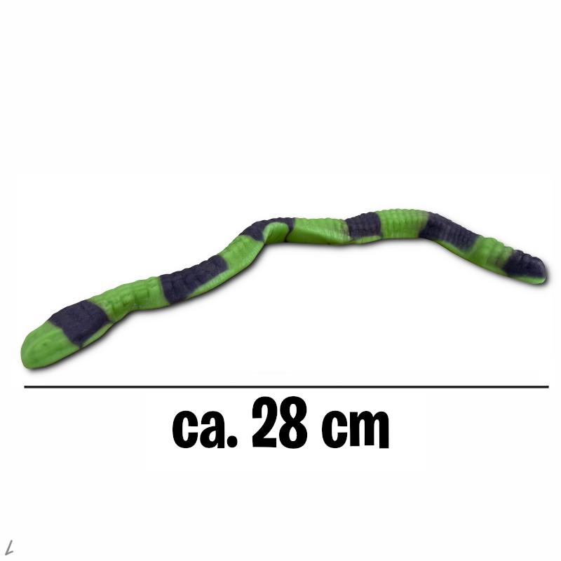Beschreibung: Die Riesen-Fruchtgummi Schlangen sind ca. 28 cm lang, gestreift und lecker. Ideal für langen Genuss oder auch als Deko für Halloween.