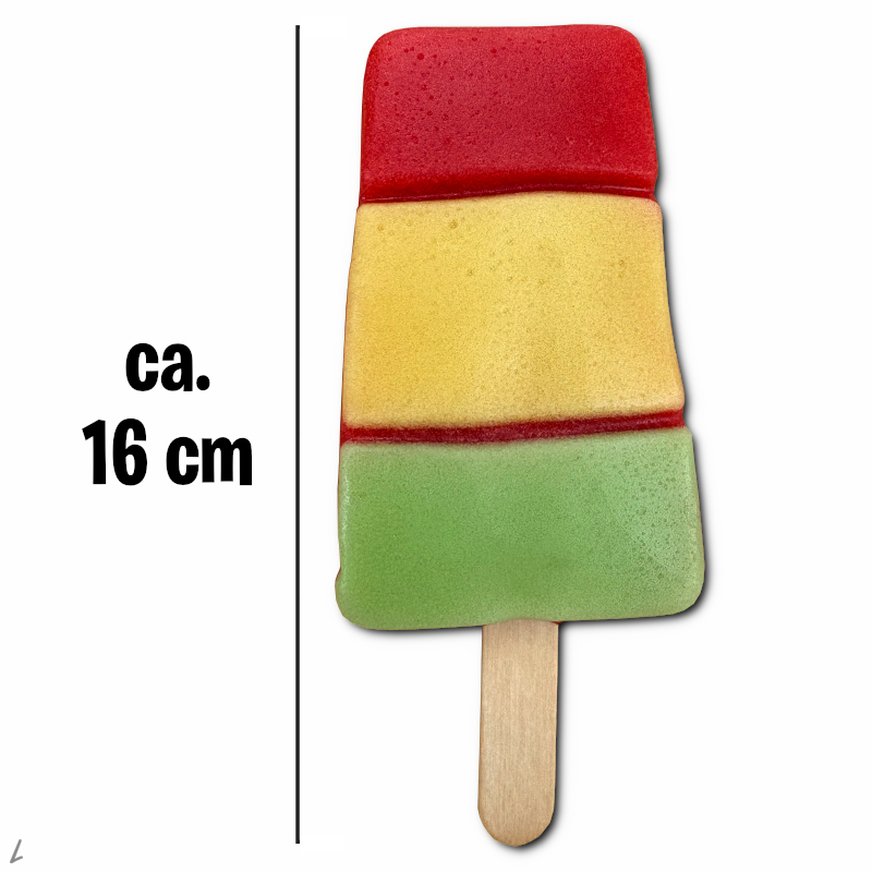 Beschreibung: Das etwas andere Eis am Stiel gibt es von Felko. Hergestellt aus buntem Fruchtgummi wird es nicht wegschmelzen und eignet sich somit auch als originelle Geschenkidee. Das dreifarbige Eis kommt in den Geschmacksrichtungen Erdbeere, Banane und Apfel. Das Eis mit Stiel ist ca. 15 cm groß und ca. 7 cm breit.