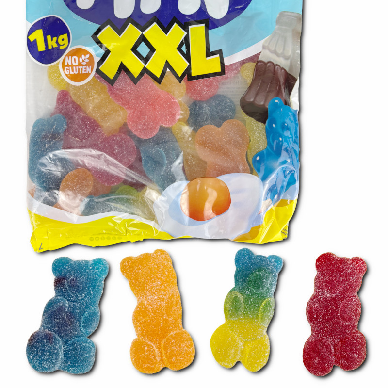 Beschreibung: Saures Riesenfruchtgummi in der Form von Bären. Sie sind ca. 8,5 cm groß und kommen in verschiedenen Farben.