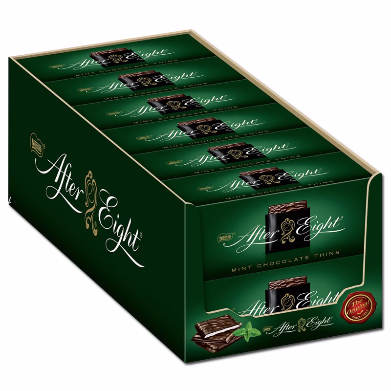 Wer kennt sie nicht, die zarten Schokotäfelchen mit der minzigen Fondant-Füllung? Die flachen, kleinen Schokoquadrate, jedes stilvoll in einem eigenen Tütchen, waren ursprünglich von der englischen Firma Rowntree’s für den englischen Markt konzipiert, denn dort wird nach dem abendlichen Dinner gern etwas Pfefferminz angeboten. Aus dieser Gewohnheit entstand auch der Name des Produktes, denn zumeist endete das Dinner gegen 8.00 Uhr abends. Danach, also After Eight war dann Zeit für das Pfefferminz zum Dessert.