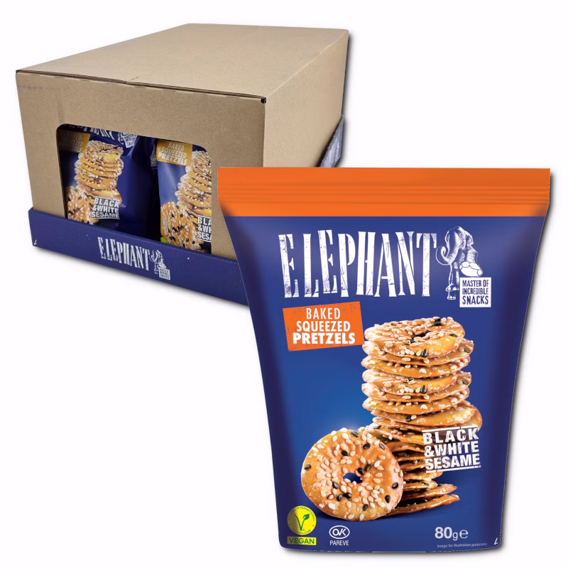 Elephant Baked Squeezed Pretzels Black & White Sesam, Laugengebäck, 12 Beutel je 80g