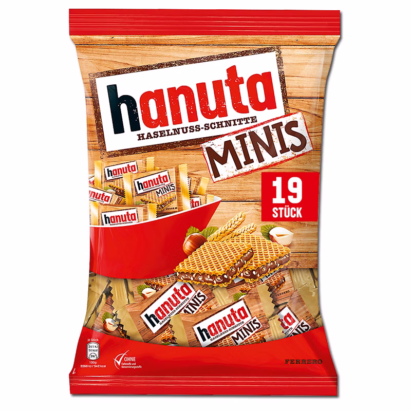 Hanuta ist der beliebte Haselnuss-Waffelschnitt von Ferrero, der seit 1959 Generationen begeistert. Zwischen zwei knusprig gebackenen Waffeln verbindet sich eine zarte Kakaocreme mit knackigen Haselnussstückchen zu einem unverwechselbaren Geschmackserlebnis – perfekt für den kleinen Genuss zwischendurch, unterwegs oder geteilt mit Freund:innen und Familie.