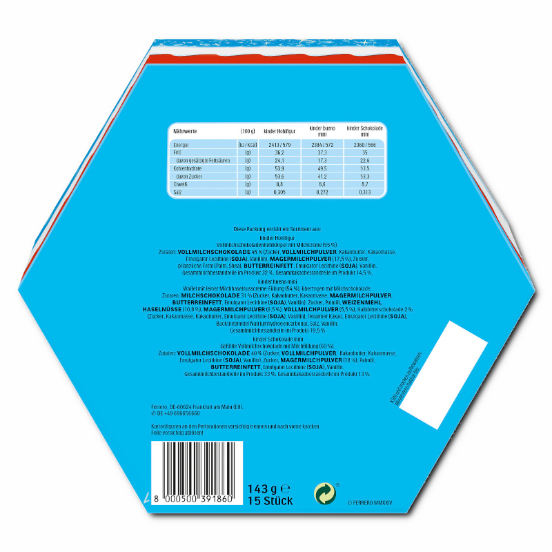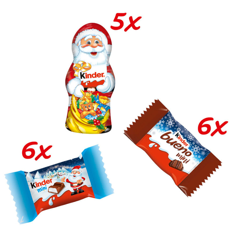 Zutaten: Schokolade Mini: Vollmilchschokolade 40 % (Zucker, Vollmilchpulver, Kakaobutter, Kakaomasse, Emulgator Lecithine (Soja), Vanillin), Zucker, Magermilchpulver (18%), Palmöl, Butterreinfett, Emulgator Lecithine (Soja), Vanillin. Gesamtmilchbestandteile im Produkt 33 %. Gesamtkakaobestandteile im Produkt 13 %. Schokolade Hohlfigur: Vollmilchschokolade 45 % (Zucker, Vollmilchpulver, Kakaobutter, Kakaomasse, Emulgator Lecithine (Soja), Vanillin), Magermilchpulver (17,5 %), Zucker, pflanzliche Fette (Palm, Shea), Butterreinfett, Emulgator Lecithine (Soja), Vanillin. Gesamtmilchbestandteile im Produkt 32 %. Gesamtkakaobestandteile im Produkt 14,5 %. Bueno Mini: Milchschokolade 31 % (Zucker, Kakaobutter, Kakaomasse, Magermilchpulver, Butterreinfett, Emulgator Lecithine (Soja), Vanillin), Zucker, Palmöl, Weizenmehl, Haselnüsse (10,8 %), Magermilchpulver (8,5%), Vollmilchpulver (5,5%), Halbbitterschokolade 2% (Zucker, Kakaomasse, Kakaobutter, Emulgator Lecithine (Soja), Vanillin), fettarmer Kakao, Emulgator Lecithine (Soja), Backtriebmittel: Natriumhydrogencarbonat, Ammoniumhydrogencarbonat; Salz, Vanillin. Gesamtmilchbestandteile im Produkt 19,4 %.