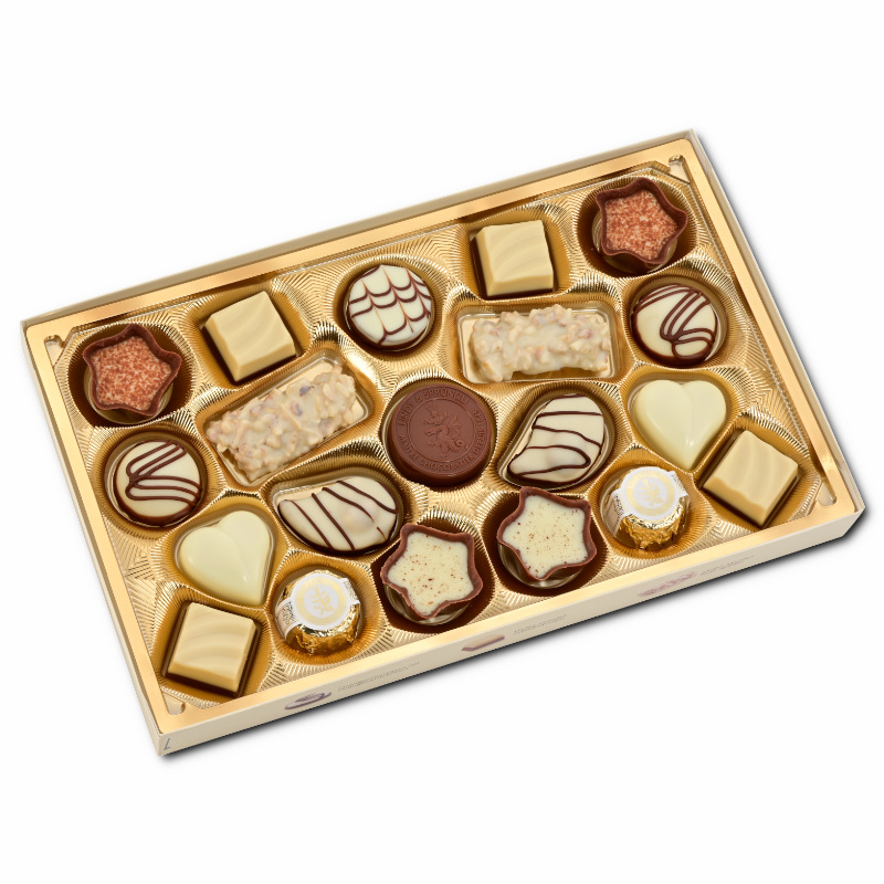 Beschreibung: Eine Pralinenmischung über überwiegend hellen Kreationen. Besonders geeignet für Freunde weißer Schokolade, aber auch für Pralinenliebhaber, die die Abwechslung suchen. Enthalten sind die Sorten Ganze Haselnuss auf Edelnougat, Caramel-Krokant Herz, Nuss-Krokant Taler, Haselnuss Nougat im Goldmantel, Macchiato-Stern, Crème-Brûlée Stern, Marc de Champagne Trüffel, Heller Mandel-Schichtnougat, Heller Mandel-Nuss-Splitter und Orangenmarzipan mit Orangenstückchen.