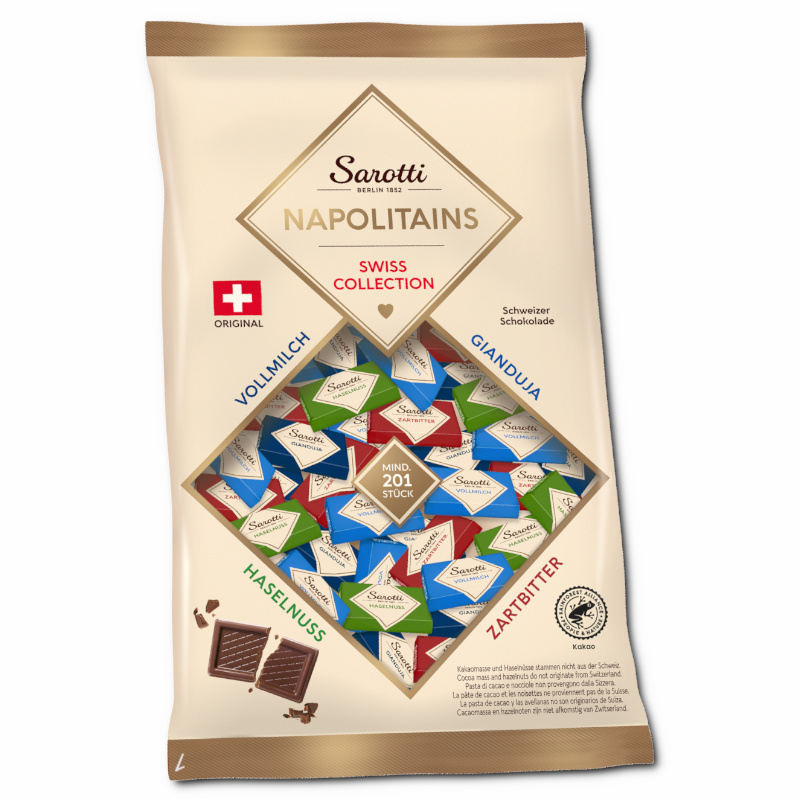 Beschreibung: Sarotti Napolitains, ein Schweizer Schokoladenklassiker. Kleine Schokoladentäfelchen in einem Mischbeutel in den Sorten Haselnuss, Zartbitter, Vollmilch und Gianduja. Ein Schokoladen-Erlebnis nach bester Schweizer Tradition, das auf der Zunge zergeht.