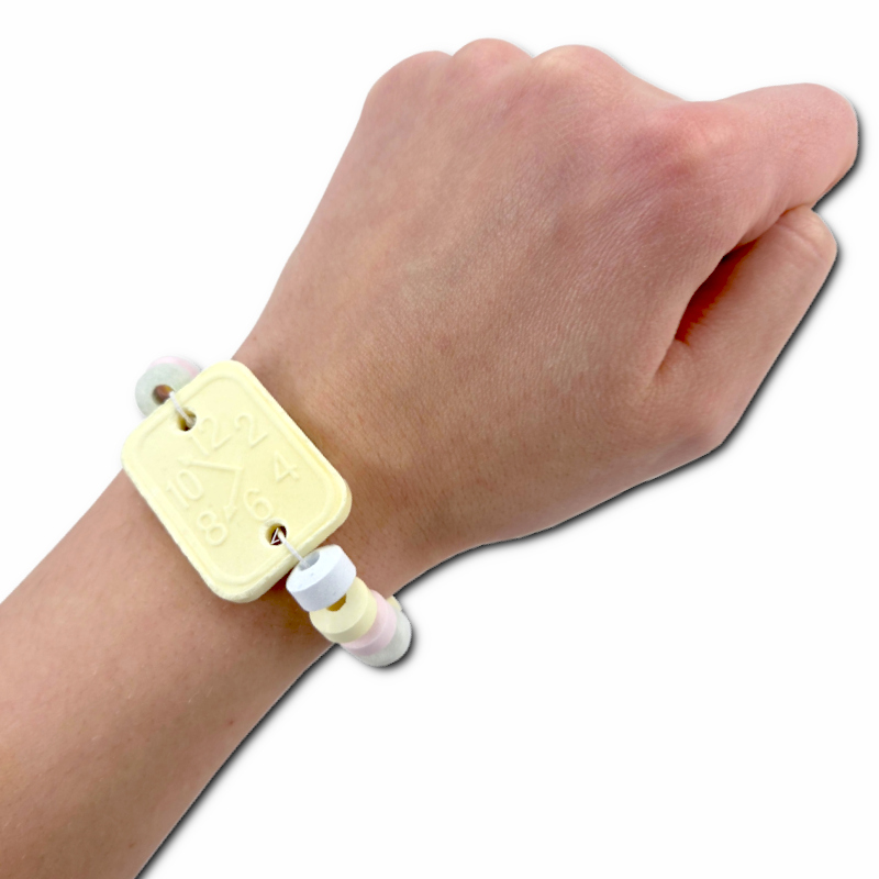 Beschreibung: Buntes Traubenzuckerkomprimat als Armbanduhr mit unterschiedlicher Zeitangabe.
